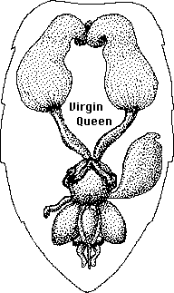 -kill sisters and mother -mate with males -lay 1500 eggs/day  = 200K eggs/year -secrete pheromone =  9-hydroxydecenoic acid  HOOC=C-C-C-C-C-C-COH-C | -mate with young queen |